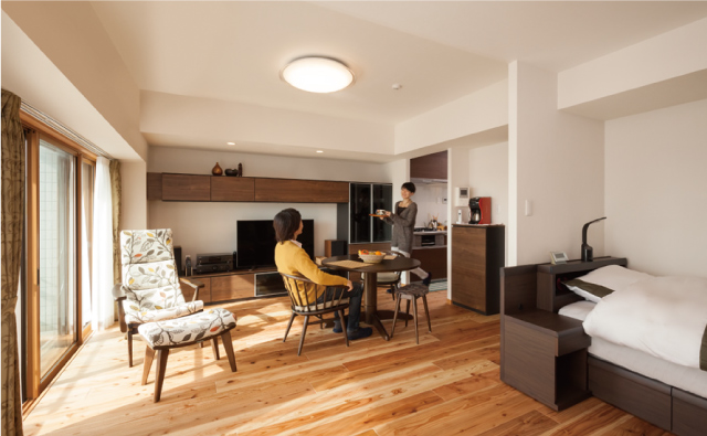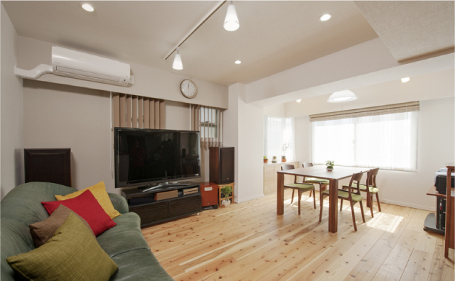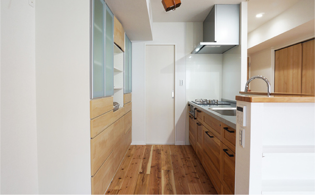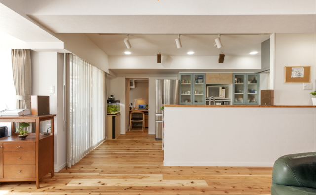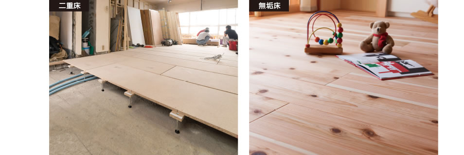 共用部分である床に二重床を設置し、その上に無垢材を敷設。無垢材の性質に合わせた床システムにすることで、